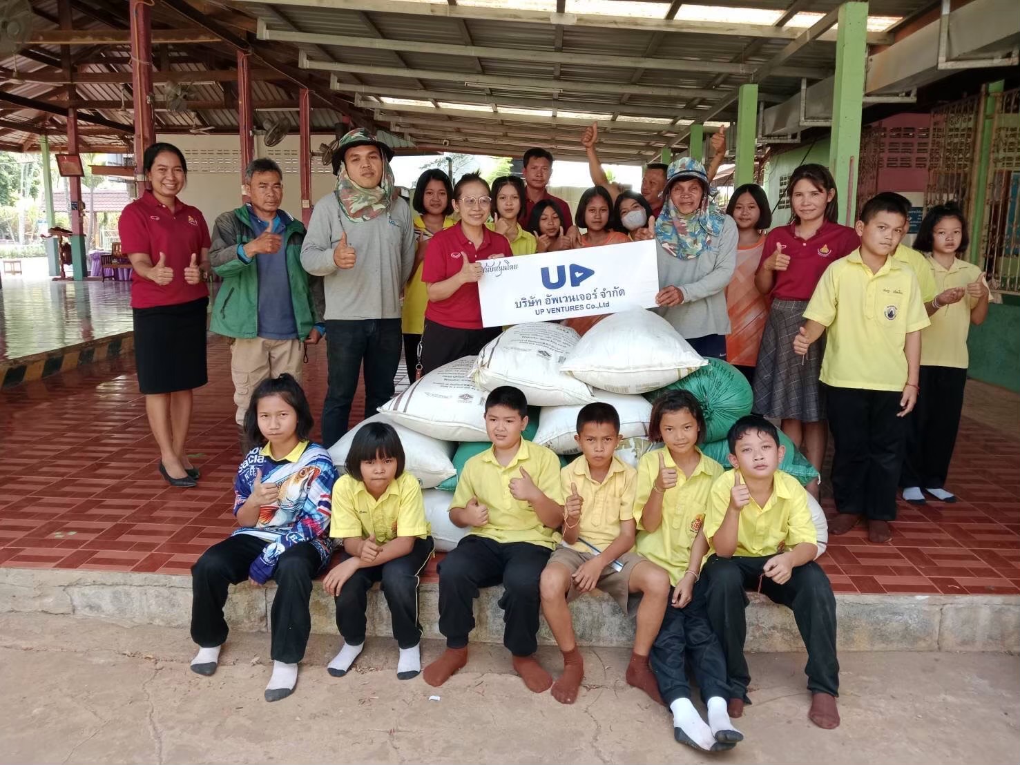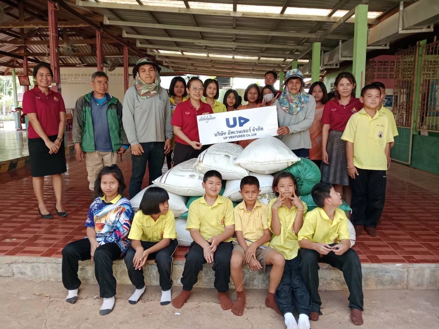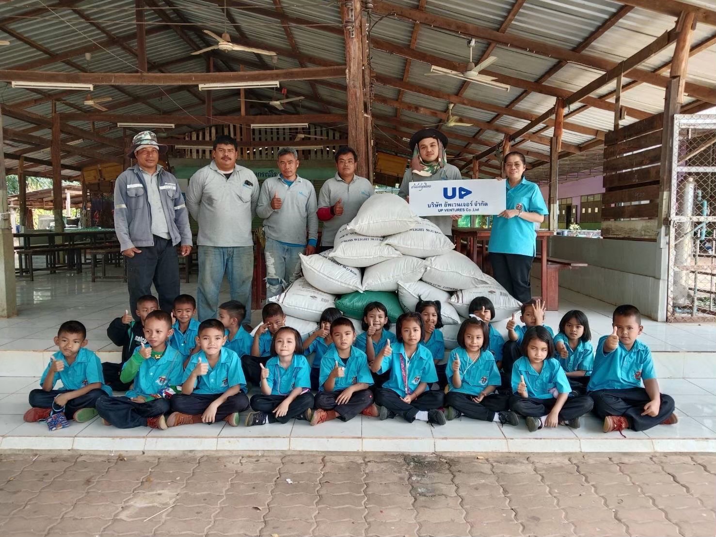 เนื่องด้วย บริษัท อัพเวนเจอร์ จำกัด จำกัด มีพื้นที่เป็นแปลงนาข้าว ในช่วงต้นปีของทุกปี หลังเก็บเกี่ยวข้าวนาปีเสร็จ บริษัท อัพเวนเจอร์ จำกัด จะเก็บรวบรวมข้อมูลข้าวเปลือกประจำปี เพื่อทำสต็อกข้าว หลังจากนั้นก็นำข้าวเปลือกจำนวนหนึ่ง มาดำเนินกิจกรรม มอบข้าวเปลือก เพื่ออาหารกลางวัน แก่โรงเรียนพื้นที่รอบๆบริษัท ในพื้นที่หลัก 3 ตำบล ประกอบด้วย ตำบลตะแบกบาน ตำบลเฉลียง ตำบลโคกกระชาย นอกจากนี้ ยังกระจายไปยังโรงเรียนในตำบลข้างเคียงอีกหลายโรงเรียน อาทิ โรงเรียนใน ตำบลมาบตะโกเอน ตำบลสระว่านพระยา เป็นต้น