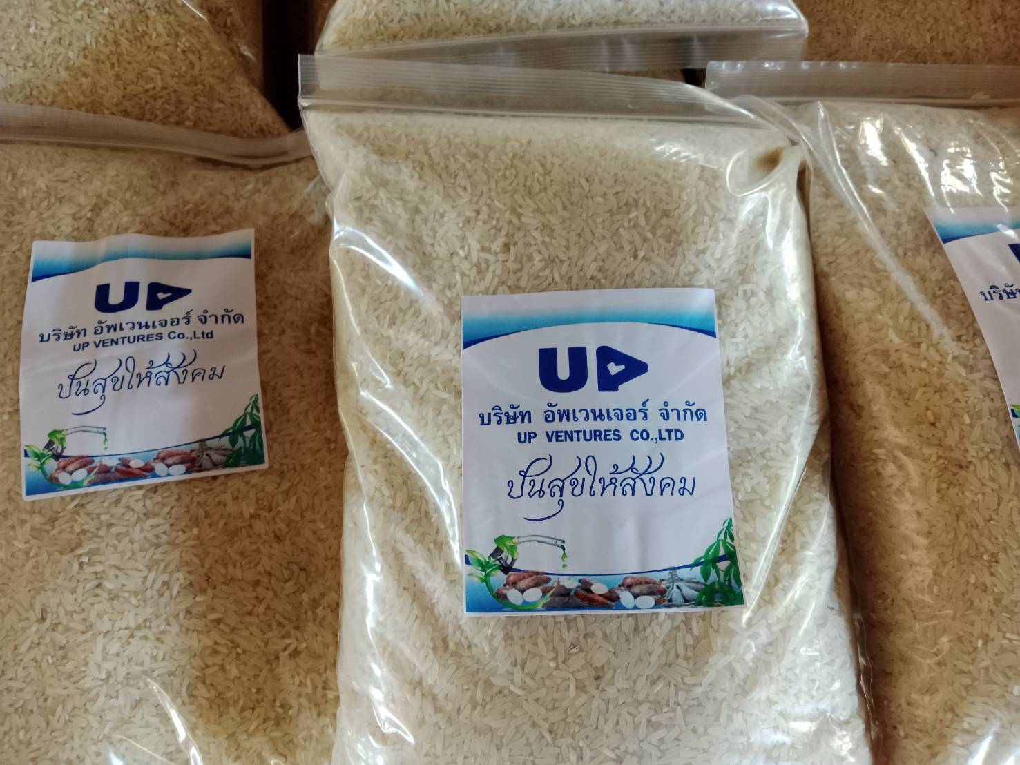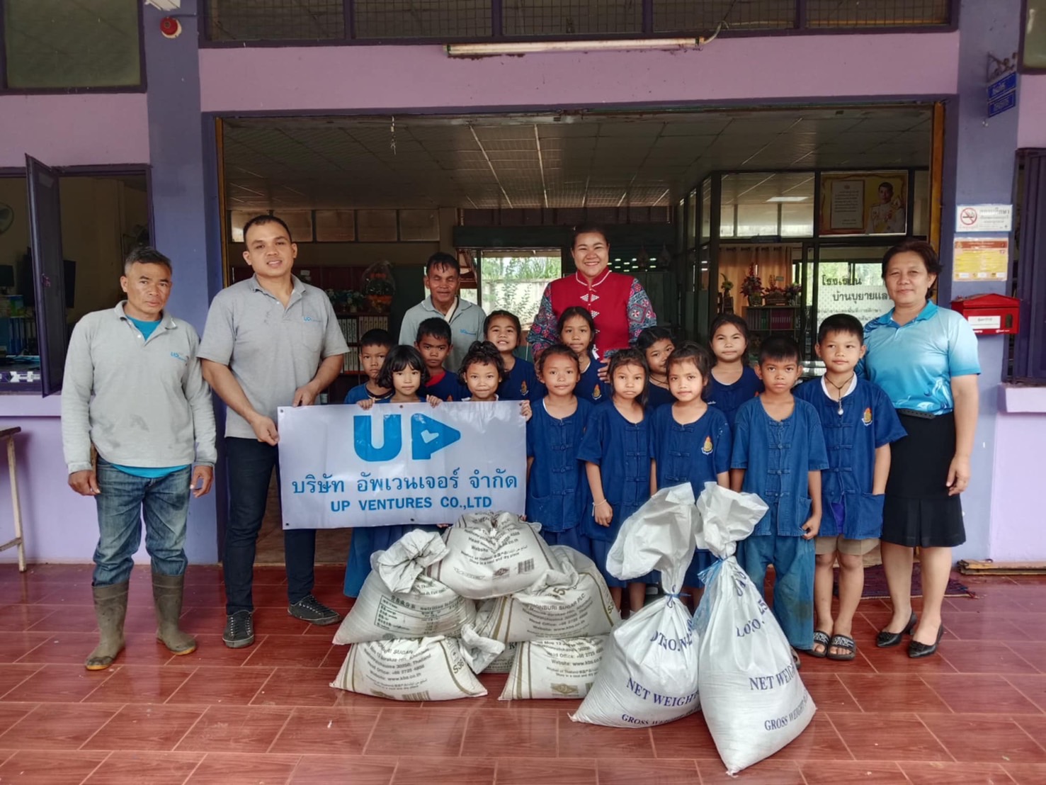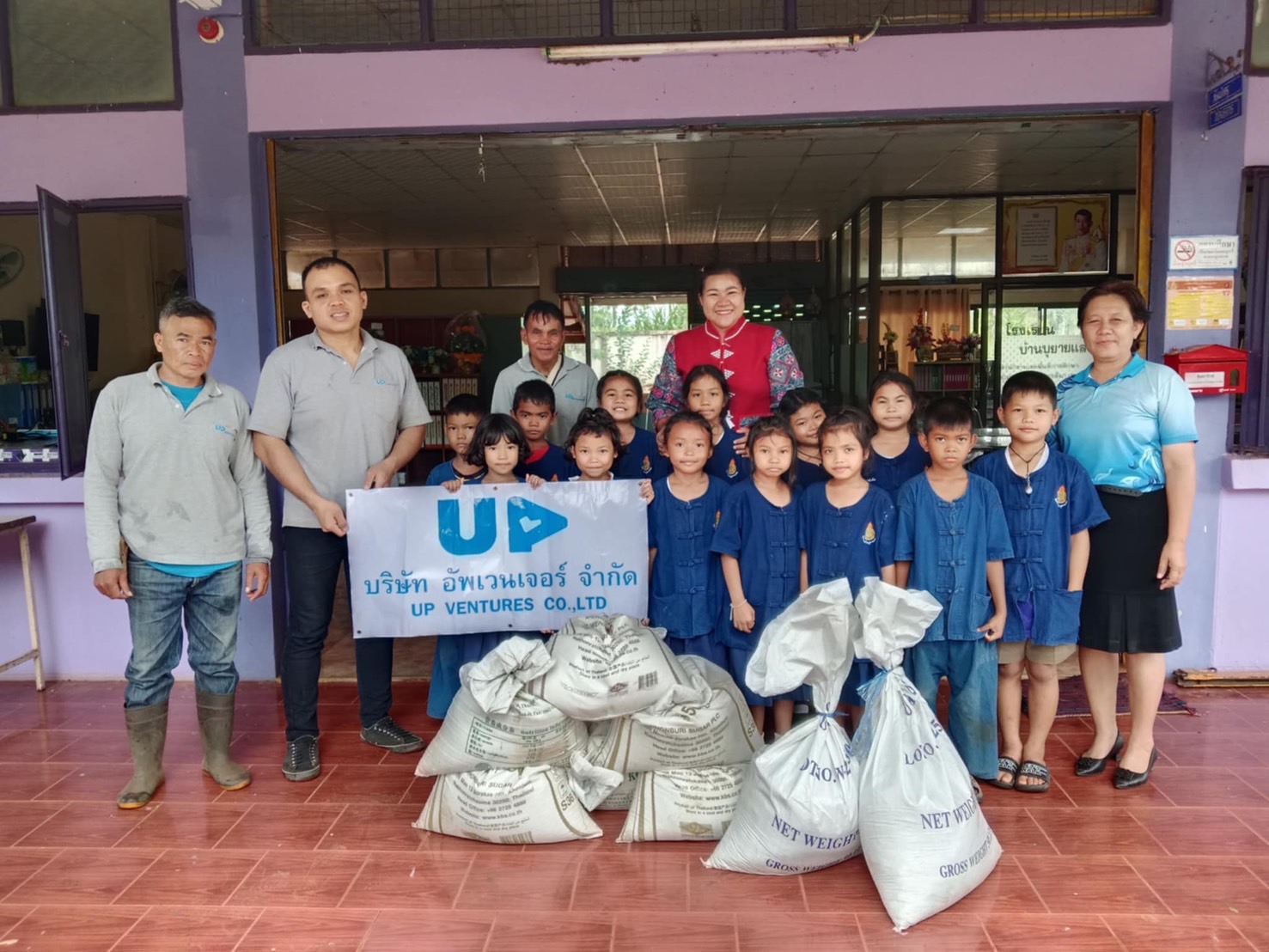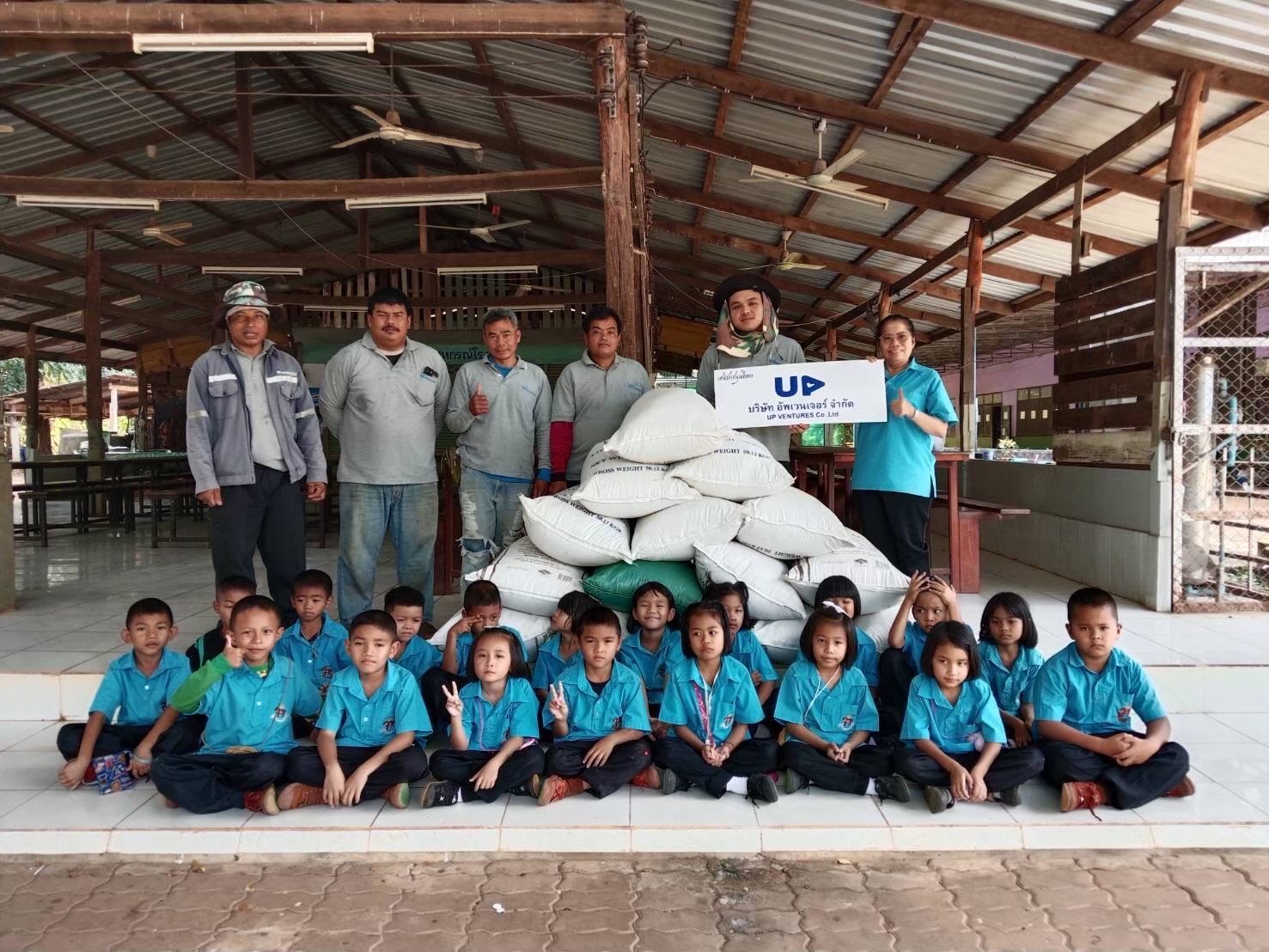 เนื่องด้วย บริษัท อัพเวนเจอร์ จำกัด จำกัด มีพื้นที่เป็นแปลงนาข้าว ในช่วงต้นปีของทุกปี หลังเก็บเกี่ยวข้าวนาปีเสร็จ บริษัท อัพเวนเจอร์ จำกัด จะเก็บรวบรวมข้อมูลข้าวเปลือกประจำปี เพื่อทำสต็อกข้าว หลังจากนั้นก็นำข้าวเปลือกจำนวนหนึ่ง มาดำเนินกิจกรรม มอบข้าวเปลือก เพื่ออาหารกลางวัน แก่โรงเรียนพื้นที่รอบๆบริษัท ในพื้นที่หลัก 3 ตำบล ประกอบด้วย ตำบลตะแบกบาน ตำบลเฉลียง ตำบลโคกกระชาย นอกจากนี้ ยังกระจายไปยังโรงเรียนในตำบลข้างเคียงอีกหลายโรงเรียน อาทิ โรงเรียนใน ตำบลมาบตะโกเอน ตำบลสระว่านพระยา เป็นต้น